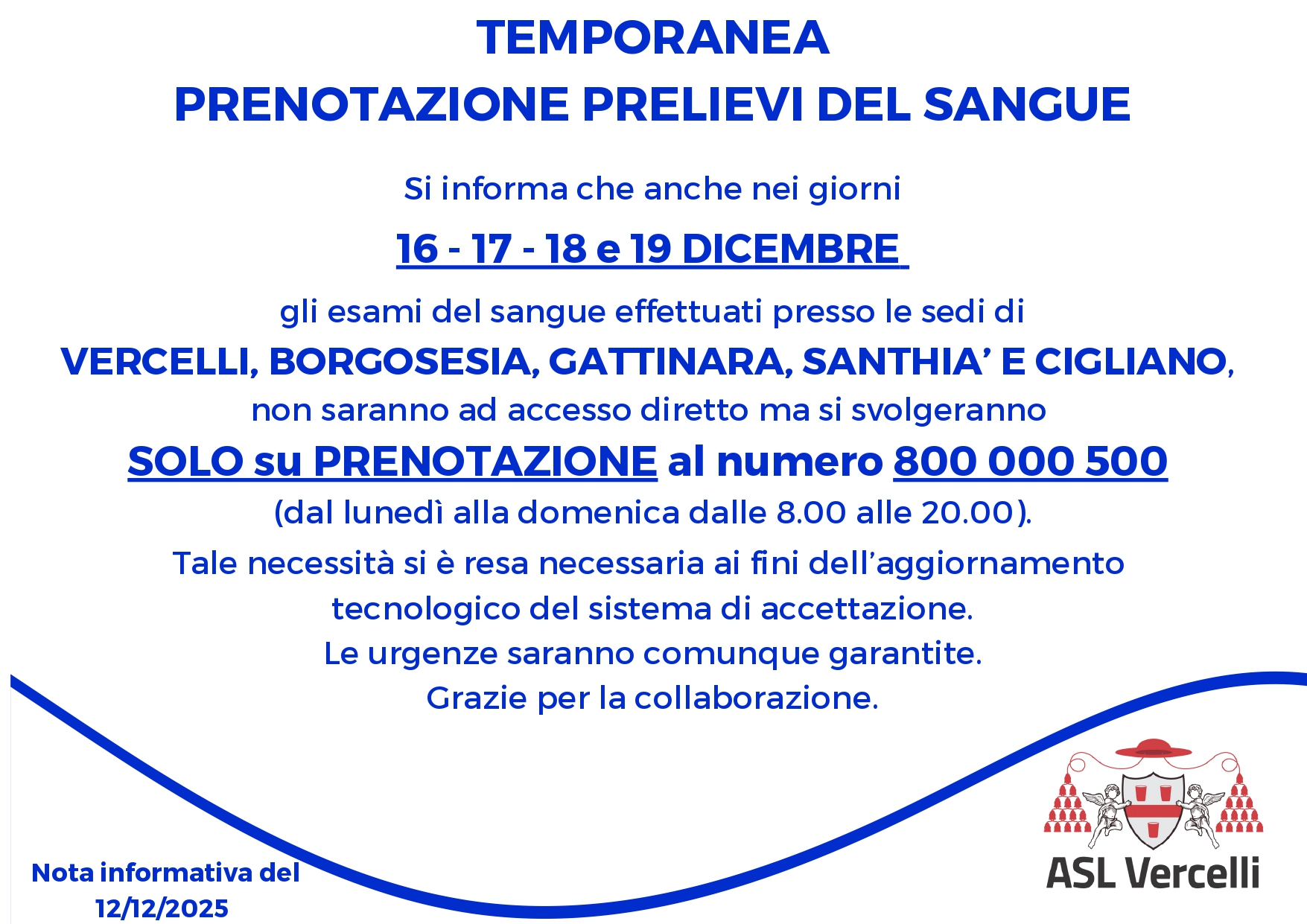 ASL VC - Aggiornamento prelievi del sangue: accesso su prenotazione fino al 19 dicembre