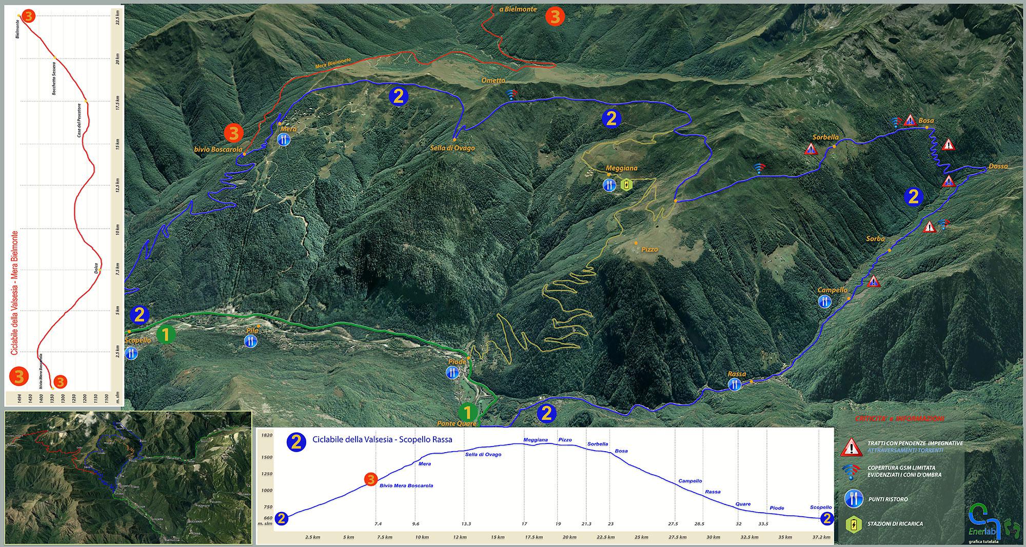 L’anello in quota della ciclabile della Valsesia parte da Scopello salendo verso l’Alpe di Mera (possibile la salita con seggiovia nei periodi apertura) ove incrocia la pista ciclabile proveniente da Oasi Zegna (GTB), su tratto asfaltato. Inizia qui il tratto più panoramico, su fondo naturale, con andamento quasi pianeggiante verso la cresta della Sella d’Ovago ed all’alpe Meggiana di Piode, con grande visuale verso il Monte Rosa. Si prosegue con il traverso in quota incrociando gli alpeggi Pizzo e Sorbella, per poi ridiscendere verso il caratteristico abitato di Rassa. Qui si riprende il tratto in asfalto lungo la strada provinciale che collega Rassa alla località Piana dove si prosegue per Piode con un tratto promiscuo in fondo naturale. Per evitare la provinciale a Rassa è possibile utilizzare in alternativa il servizio Flexibus a chiamata con trasporto biciclette.